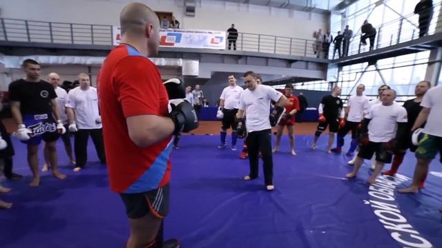 Фёдор Емельяненко демонстрирует технику отработки лоу-киков, хай-киков, фронт-киков и ударов с разножки на семинаре в Челябинске.