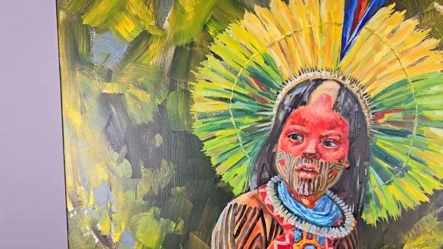 80x80 cm, acrylic, oil on canvas / Acryl, Öl, Leinwand / холст, масло, акрил In the portrait from the series "Children of the World" we see a boy from the Kayapo tribe with full face and body paint. The little Indian is wearing a headdress made of bird feathers and lots of beaded jewelry. The Kayapo hairstyle typically includes shaving the crown. The boy has just been playing with a bird, which replaces his toy, but now he is lost in his thoughts. I wonder what this young Indian is thinking about? The Kayapo tribe lives on the banks of the Amazon River in Brazil. The Indians of this tribe insert plates into their lower lips and always pierce their ears, since "fool" in their language is a person without a hole in his ears. Girls of the tribe from the age of 12-13 are given to be raised by an adult man, who teaches her to be a good wife. And the boys go through an incredibly painful ritual of initiation into warriors. They must throw a wasp's nest from the top of a tree. Those who descend on their own after this are considered warriors, ready to defend the tribe. A legend of the Kayapo tribe says that once upon a time, a long time ago, a deity descended from the sky to them, left heirs, taught them medicine and hunting, and then flew back to the sky in a burning house. Research has shown that in places where this tribe lives, the level of radiation is increased, which may indirectly confirm the theory of the intervention of another mind in the life of the Kayapo tribe. The painting is ready to hang on the wall and is equipped with hooks. It is made in mixed media, acrylic and oil on canvas. You can buy my paintings on / Мои картины можно приобрести на / Meine Bilder sind hier zu kaufen https://www.singulart.com/en/artist/anna-shesterikova-19385 https://www.1stdibs.com/creators/anna-shesterikova/ Instagram https://www.instagram.com/anna_shesterikova_art/ Facebook https://www.facebook.com/profile.php?id=1554265169 Мои стихи можно найти на https://stihi.ru/avtor/buchs5 Музыка: Bet On It - Silent Partner