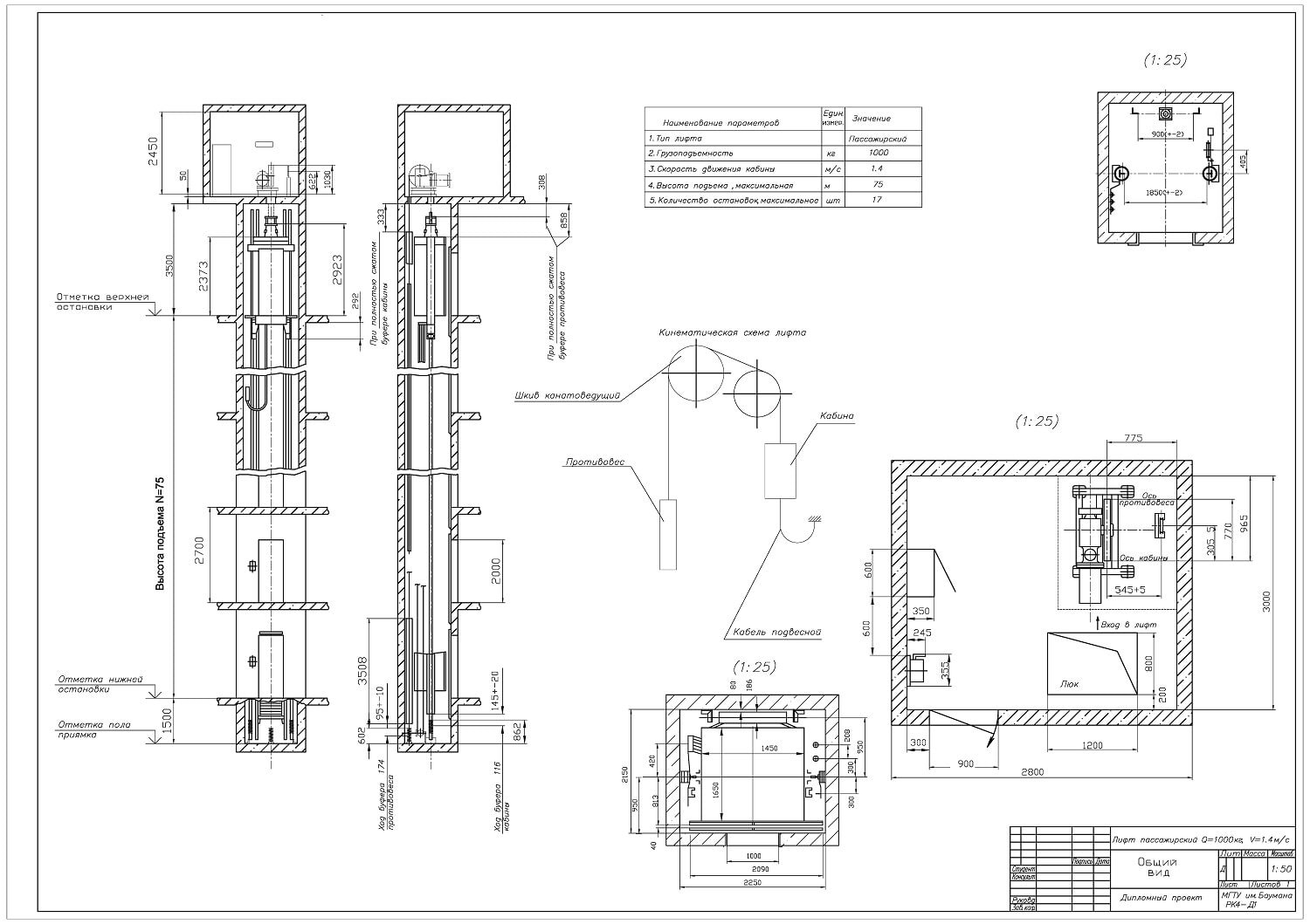 Чертежи и расчёты лифта пассажирского грузоподъемностью 1000 кг и скоростью 1,4 м/с в дипломе