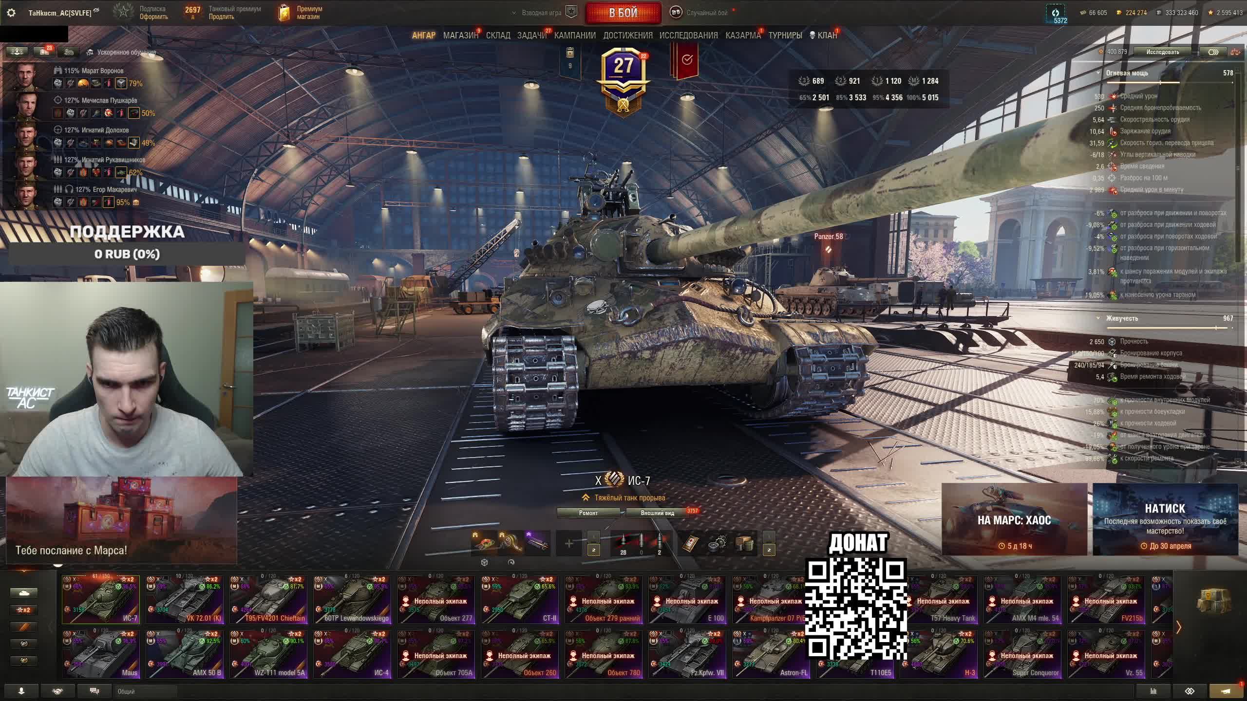 Поддержать стримера http://www.donationalerts.ru/r/tahkucm_ac Сбер без комиссии 2202 2062 2408 9735 напишите в чате, чтобы проверил Telegram https://t.me/TaHkucm_AC Канал VK Play Live https://vkplay.live/tahkucm Канал Бусти https://boosty.to/tahkucm Канал на трово https://trovo.live/TaHkucm_AC Канал Яндекс Дзен https://dzen.ru/id/62355e95d406852937d33526 Группа Вконтакте https://vk.com/tahkucm_ac Оборудование и модернизации на все танки https://docs.google.com/spreadsheets/d/16koQOrtKQKQrAy2Pgfm6GBeG8bA1tJP_7Vm78knwUXA/edit#gid=422106233 Настройки игры в скринах https://dzen.ru/a/YmFvHhJ9yi3rZO5M Моды со скринами установки https://vk.com/topic-136212047_47639792 По поводу рекламы писать в личку https://vk.com/v_xarlamow Всем привет! Меня зовут Виктор, мой ник TaHkucm_AC. На моем канале стрим мира танков каждый день с 8 или 9 по мск. Так же иногда стримлю вечером в произвольное время, чтобы не пропустить подпишитесь на оповещения в телеге или вк (ссылки выше). Играю в танки с декабря 2011 года, а стримить начал в начале 2017 года. Во время стримов общаюсь с чатом, помогаю советами по игре, объясняю тактику. Средняя статистика 65% побед и 4-5к вн8. Фан кланы SLPFR - Командиры marmyn и artlay - из требований только то, чтобы вы часто играли в танки. Укреп 10 уровня. Участвуют в ивентах на ГК, как минимум чтобы собрать пропуск на аукцион. L-DS - Командир DarkSpawn13. Укреп 10 уровня, плюхи по кд SVLFE - Командир Shadowlions. Требуется Team Speak (программа связи) для взводов и клановых покатушек. Участвуют в ивентах на ГК, как минимум чтобы собрать пропуск на аукцион. укреп 10 уровня