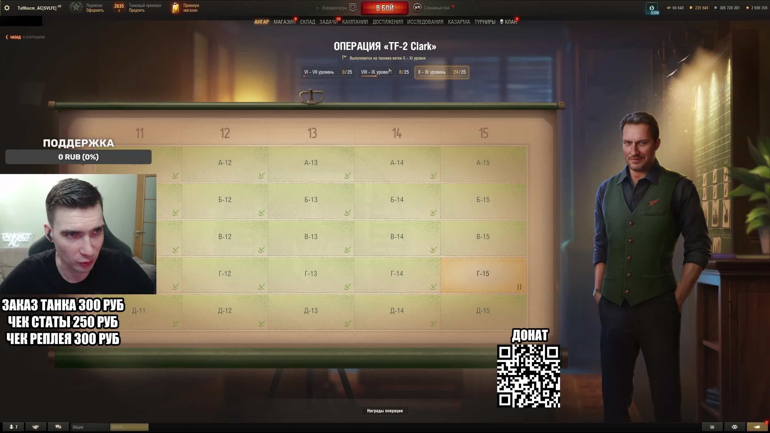 Поддержать стримера http://www.donationalerts.ru/r/tahkucm_ac Сбер без комиссии 2202 2062 2408 9735 напишите в чате, чтобы проверил Telegram https://t.me/TaHkucm_AC Канал VK Play Live https://vkplay.live/tahkucm Канал Бусти https://boosty.to/tahkucm Канал на трово https://trovo.live/TaHkucm_AC Канал Яндекс Дзен https://dzen.ru/id/62355e95d406852937d33526 Группа Вконтакте https://vk.com/tahkucm_ac Оборудование и модернизации на все танки https://docs.google.com/spreadsheets/d/16koQOrtKQKQrAy2Pgfm6GBeG8bA1tJP_7Vm78knwUXA/edit#gid=422106233 Настройки игры в скринах https://dzen.ru/a/YmFvHhJ9yi3rZO5M Моды со скринами установки https://vk.com/topic-136212047_47639792 По поводу рекламы писать в личку https://vk.com/v_xarlamow Всем привет! Меня зовут Виктор, мой ник TaHkucm_AC. На моем канале стрим мира танков каждый день с 8 или 9 по мск. Так же иногда стримлю вечером в произвольное время, чтобы не пропустить подпишитесь на оповещения в телеге или вк (ссылки выше). Играю в танки с декабря 2011 года, а стримить начал в начале 2017 года. Во время стримов общаюсь с чатом, помогаю советами по игре, объясняю тактику. Средняя статистика 65% побед и 4-5к вн8. Фан кланы SLPFR - Командиры marmyn и artlay - из требований только то, чтобы вы часто играли в танки. Укреп 10 уровня. Участвуют в ивентах на ГК, как минимум чтобы собрать пропуск на аукцион. L-DS - Командир DarkSpawn13. Укреп 10 уровня, плюхи по кд SVLFE - Командир Shadowlions. Требуется Team Speak (программа связи) для взводов и клановых покатушек. Участвуют в ивентах на ГК, как минимум чтобы собрать пропуск на аукцион. укреп 10 уровня