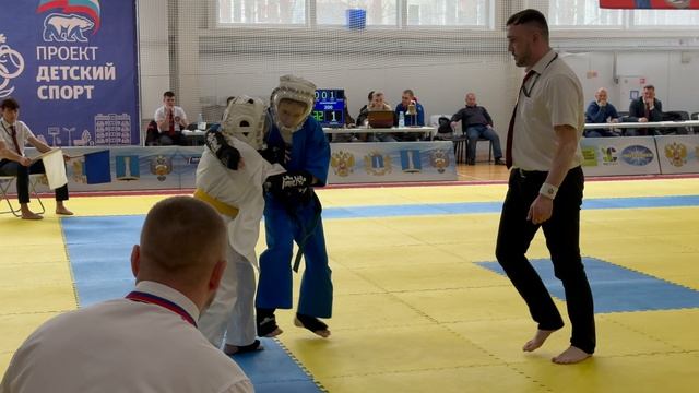 21.02.2026 в Ульяновске прошли VI Всероссийские соревнования по кудо. Бой в категории девушки до 200 ед. 12-13 лет. В синем Маргарита Жаворонкова (Респ. Татарстан), в белом Аделина Паттакова (Тюменская обл.).