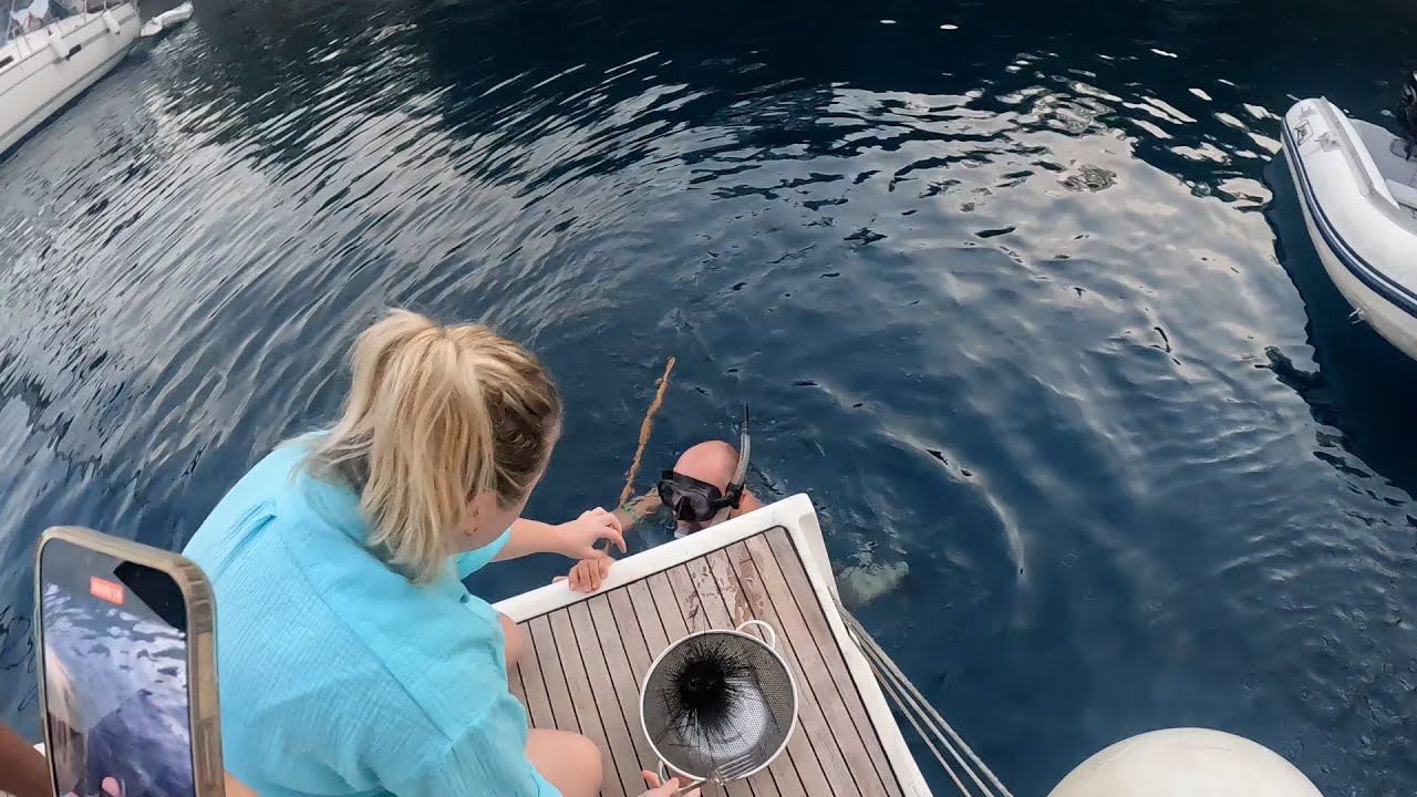 Наловили морских Ежей. Люди уходят с лодки. Регата продолжается. Турция. Яхтинг.