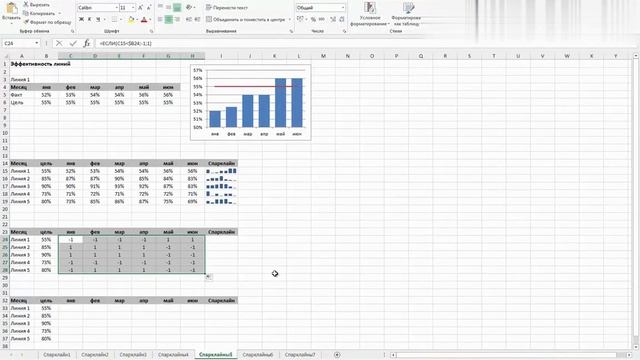 Как создать базовую линию в спарклайнах Excel? При работе со спарклайнами в Excel часто возникает необходимость сравнивать данные с целевыми показателями. Однако в стандартном функционале Excel не предусмотрена базовая линия, что затрудняет анализ. В этом уроке разберем два способа ее имитации! Что вы узнаете из видео? ✔ Почему в спарклайнах нет базовой линии и как это исправить? ✔ Как преобразовать данные, чтобы обозначить превышение цели? ✔ Как построить спарклайн "Выигрыш или проигрыш" для анализа результатов? ✔ Как использовать разницу значений для более наглядного сравнения? Как имитировать базовую линию? 1️⃣ Метод 1: Используем единицы и минус единицы, чтобы обозначить превышение или недостижение целевого показателя. 2️⃣ Метод 2: Вычитаем целевое значение из фактического, чтобы показать разницу в выполнении цели. Для первого метода создаем спарклайн "Выигрыш или проигрыш", который четко покажет, когда цель была достигнута. Для второго метода строим гистограмму, где отрицательные значения отображают невыполнение цели. Почему это важно? Базовая линия помогает анализировать тренды и отклонения. Наглядность графиков повышает эффективность отчетов. Правильное масштабирование делает анализ данных удобнее. Практическое применение В видео разбираем реальный пример, где данные о показателе эффективности по месяцам анализируются с использованием двух разных подходов. Вы увидите разницу в визуализации и научитесь выбирать наиболее удобный вариант! ✅ Смотрите видео до конца и научитесь создавать профессиональные отчеты в Excel! #Excel #Графики #АнализДанных #Спарклайны #Отчеты