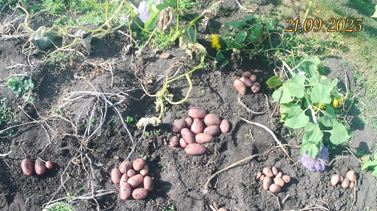 21.09.2025г. на втором участке накопал 50 литров крупной картошки, 6 литров семенной и 10 литров мелкой, резанной на корм скотине. 23.09.2025г. на первом участке накопал 17 вёдер крупной картошки, 31 литр семенной, а мелкую и резанную не считал. 15.04.2026г. из ледяного погреба достал семенной картофель и убрал в подвал на прорастание, в тёплое место, где температура +21. Картофель садил под лопату с добавлением гранёного стакана высушенного биогумуса, на оба участка ушло 180 литров биогумуса. В следующем сезоне продолжу выращивать по такому же принципу, выращивать лекарственный продукт, который не обрабатывается безопасными ядами и пр. агрохимией.