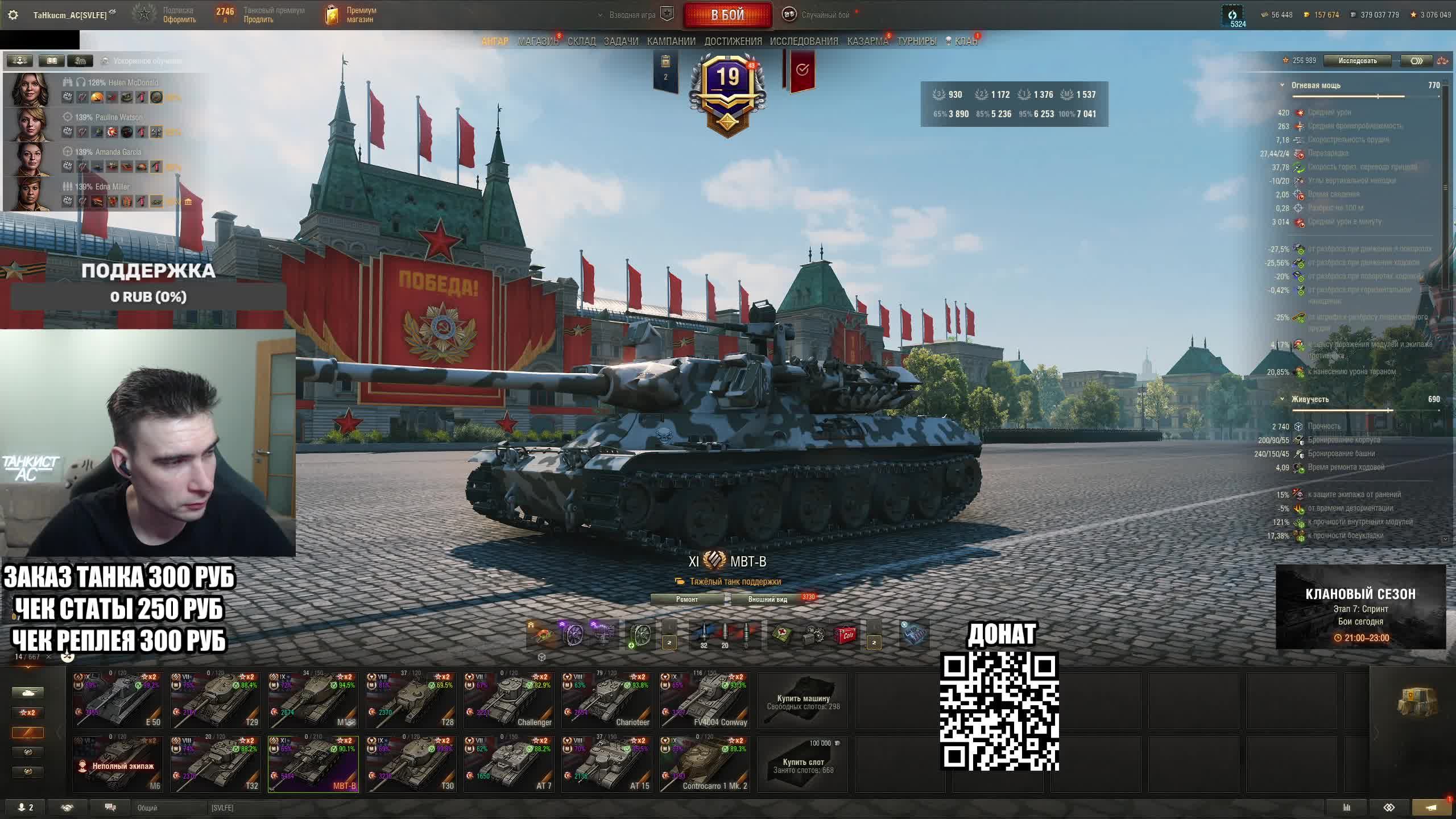 Поддержать стримера http://www.donationalerts.ru/r/tahkucm_ac Сбер без комиссии 2202 2062 2408 9735 напишите в чате, чтобы проверил Telegram https://t.me/TaHkucm_AC Канал VK Play Live https://vkplay.live/tahkucm Канал Бусти https://boosty.to/tahkucm Канал на трово https://trovo.live/TaHkucm_AC Канал Яндекс Дзен https://dzen.ru/id/62355e95d406852937d33526 Группа Вконтакте https://vk.com/tahkucm_ac Оборудование и модернизации на все танки https://docs.google.com/spreadsheets/d/16koQOrtKQKQrAy2Pgfm6GBeG8bA1tJP_7Vm78knwUXA/edit#gid=422106233 Настройки игры в скринах https://dzen.ru/a/YmFvHhJ9yi3rZO5M Моды со скринами установки https://vk.com/topic-136212047_47639792 По поводу рекламы писать в личку https://vk.com/v_xarlamow Всем привет! Меня зовут Виктор, мой ник TaHkucm_AC. На моем канале стрим мира танков каждый день с 8 или 9 по мск. Так же иногда стримлю вечером в произвольное время, чтобы не пропустить подпишитесь на оповещения в телеге или вк (ссылки выше). Играю в танки с декабря 2011 года, а стримить начал в начале 2017 года. Во время стримов общаюсь с чатом, помогаю советами по игре, объясняю тактику. Средняя статистика 65% побед и 4-5к вн8. Фан кланы SLPFR - Командиры marmyn и artlay - из требований только то, чтобы вы часто играли в танки. Укреп 10 уровня. Участвуют в ивентах на ГК, как минимум чтобы собрать пропуск на аукцион. L-DS - Командир DarkSpawn13. Укреп 10 уровня, плюхи по кд SVLFE - Командир Shadowlions. Требуется Team Speak (программа связи) для взводов и клановых покатушек. Участвуют в ивентах на ГК, как минимум чтобы собрать пропуск на аукцион. укреп 10 уровня