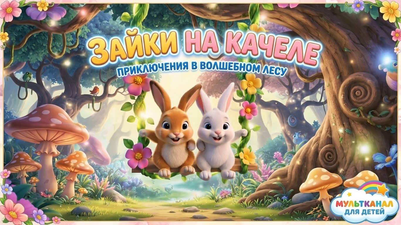 Милые зайчики качаются на качеле в сказочном лесу