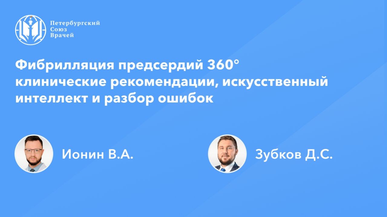 Фибрилляция предсердий 360°: клинические рекомендации, искусственный интеллект и разбор ошибок Дата проведения: 10.03.2026, 20:00 Страница мероприятия: https://spb.doctor/i/260310/ Программа: 1. Фибрилляция предсердий 360°: клинические рекомендации, искусственный интеллект и разбор ошибок Зубков Дмитрий Сергеевич, Ионин Валерий Александрович 2. Ответы на вопросы О семинаре: Онлайн-семинар посвящен комплексному подходу к лечению фибрилляции предсердий (ФП), будут разобраны актуальные клинические рекомендации, рассмотрены возможности применения искусственного интеллекта (ИИ) у пациентов с ФП: от поддержки клинических решений и мониторинга показателей до оценки прогноза повторных сосудистых событий. На сессии вопросов будет дана экспертная оценка ответов, сгенерированных с помощью ИИ.