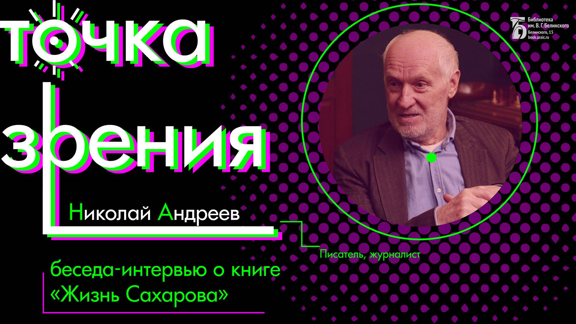 Перед вами необычный выпуск проекта: разговор пойдёт не о научной книге. Темой «Точки зрения» стала биография учёного, общественного деятеля России XX века, лауреата Нобелевской премии мира Андрея Дмитриевича Сахарова. Беседу с Николаем Алексеевичем Андреевым о его книге «Жизнь Сахарова» ведёт Надежда Маценко, заведующая редакционно-издательским отделом Библиотеки им. В.Г. Белинского. Николай Андреев – писатель, журналист, член Союза журналистов России и Союза писателей Москвы. Родился в 1947 году в городе Соль-Илецке Оренбургской области. После завершения учебы на факультете журналистики МГУ им. М.В. Ломоносова, работал в крупнейших изданиях, таких как: «Комсомольская правда», «Литературная газета», «Новое время», «Известия». С 1998 по 2002 годы Николай Алексеевич был автором и ведущим исторической программы «Как это было» телекомпании «ВиД». Автор биографических книг «Жизнь Высоцкого», «Жизнь Горбачёва», «Жизнь Сахарова». За книгу о жизни Андрея Дмитриевича Сахарова удостоен премии Союза журналистов РФ в номинации «Золотая полка российской журналистики». Свердловская областная универсальная научная библиотека им. Белинского http://book.uraic.ru/ сайт https://vk.com/club6745014 VK