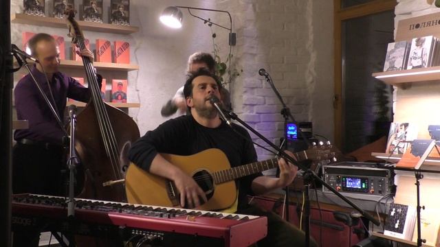 Концерт-квартирник Петра Налича с музыкантами в день рождения Издательского Дома "Поляндрия" в книжном магазине "Поляндрия Letters" на Садовой-Сухаревской, 28 сентября 2023 года. Состав: Пётр Налич (автор песен, вокал, гитара, клавиши), Геннадий Лаврентьев (скрипка, гитара), Сергей Сокулер (контрабас).