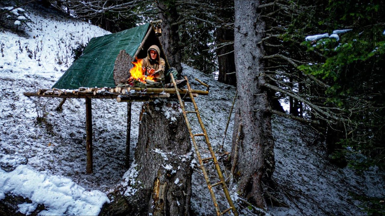 Строим полноценное ЗИМНЕЕ УБЕЖИЩЕ на старом ПНЕ в суровых условиях!