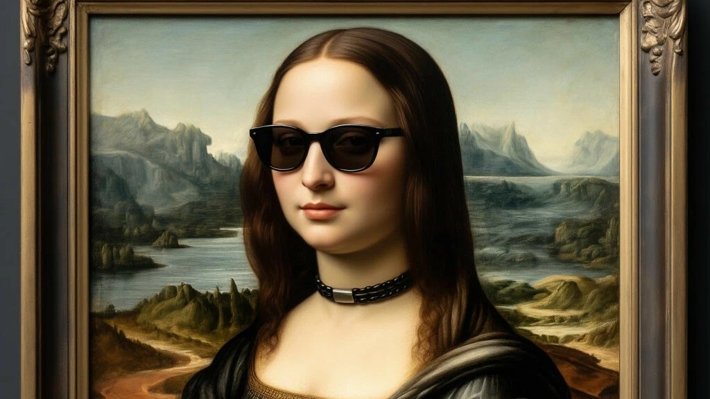 #Джоко́ндаИИ #шедевр #репликакартины Промт для изображения: An exquisite copy of Leonardo da Vinci's Mona Lisa, now with a modern interpretation. She is wearing a thin black leather necklace and stylish sunglasses perched on her head. Deeply detailed oil painting on canvas featuring the iconic sfumato. Housed in an exquisite solid antique patinated bronze frame. Masterpiece, butter texture, super detail, 4K. ugly, deformed, modern, blurry.9:16.