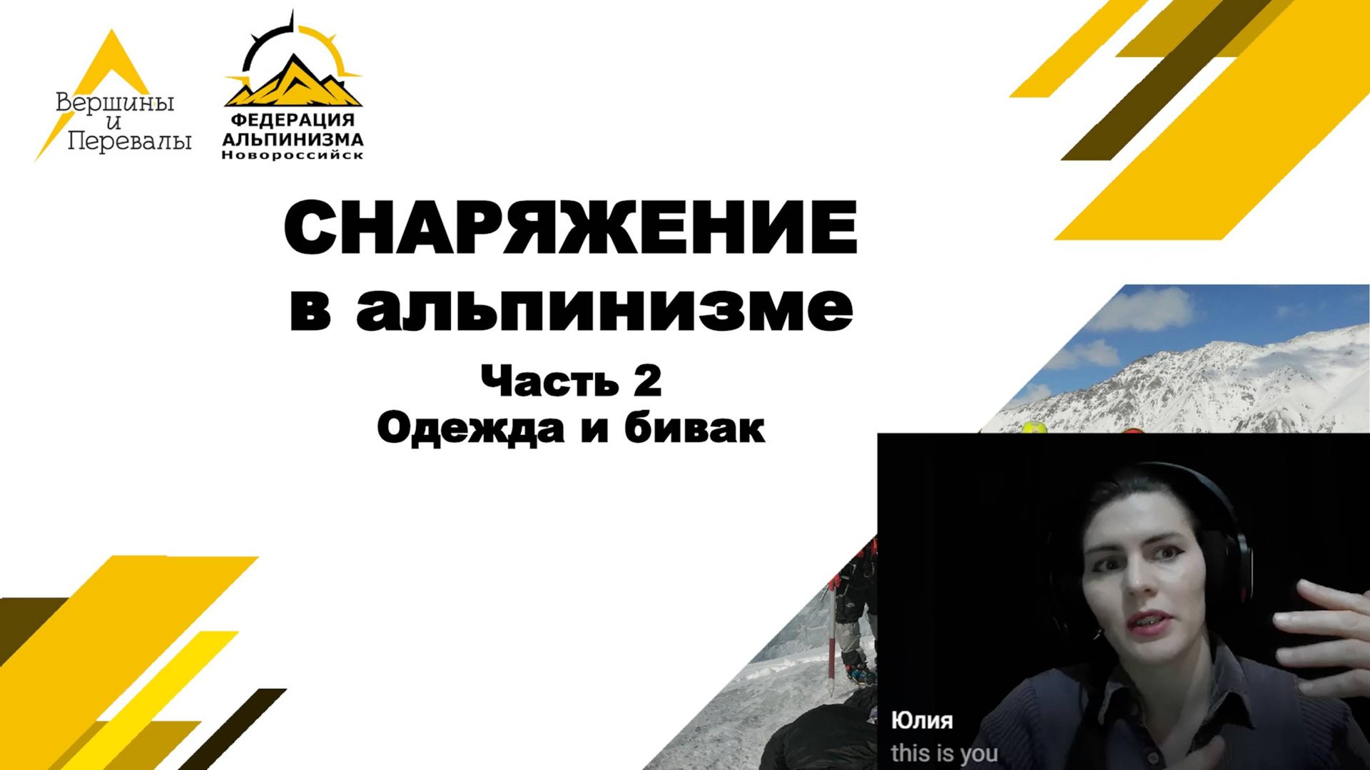 Лекция курса начальной альпинистской подготовки "Снаряжение в альпинизме", часть 2 ⓒ Горный клуб "Вершины и перевалы", г. Новороссийск Читает Коваленко Юлия 0:00 Вступление и виды активностей на альп сборах 02:08 В базовом лагере: личное снаряжение 10:03 В базовом лагере: общественное снаряжение 16:45 Снаряжение для сна 29:39 На подходе в штурмовой лагерь (треккинг) 48:49 Одежда. Теория слоёв 59:23 В штурмовом лагере 01:04:10 На скальном маршруте. Альпинистские ботинки. 01:09:34 На снежно-ледовом маршруте. Альпинистские кошки 01:16:41 На высотном маршруте 01:22:18 Общие требования к снаряжению 01:24:47 Вопрос: как выбирать и где покупать снаряжение