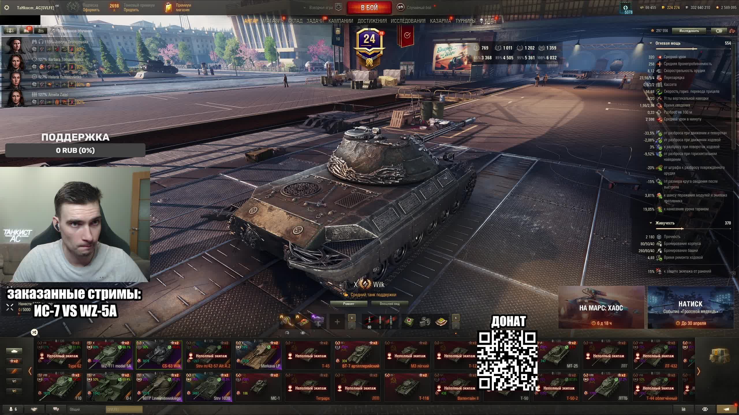 Поддержать стримера http://www.donationalerts.ru/r/tahkucm_ac Сбер без комиссии 2202 2062 2408 9735 напишите в чате, чтобы проверил Telegram https://t.me/TaHkucm_AC Канал VK Play Live https://vkplay.live/tahkucm Канал Бусти https://boosty.to/tahkucm Канал на трово https://trovo.live/TaHkucm_AC Канал Яндекс Дзен https://dzen.ru/id/62355e95d406852937d33526 Группа Вконтакте https://vk.com/tahkucm_ac Оборудование и модернизации на все танки https://docs.google.com/spreadsheets/d/16koQOrtKQKQrAy2Pgfm6GBeG8bA1tJP_7Vm78knwUXA/edit#gid=422106233 Настройки игры в скринах https://dzen.ru/a/YmFvHhJ9yi3rZO5M Моды со скринами установки https://vk.com/topic-136212047_47639792 По поводу рекламы писать в личку https://vk.com/v_xarlamow Всем привет! Меня зовут Виктор, мой ник TaHkucm_AC. На моем канале стрим мира танков каждый день с 8 или 9 по мск. Так же иногда стримлю вечером в произвольное время, чтобы не пропустить подпишитесь на оповещения в телеге или вк (ссылки выше). Играю в танки с декабря 2011 года, а стримить начал в начале 2017 года. Во время стримов общаюсь с чатом, помогаю советами по игре, объясняю тактику. Средняя статистика 65% побед и 4-5к вн8. Фан кланы SLPFR - Командиры marmyn и artlay - из требований только то, чтобы вы часто играли в танки. Укреп 10 уровня. Участвуют в ивентах на ГК, как минимум чтобы собрать пропуск на аукцион. L-DS - Командир DarkSpawn13. Укреп 10 уровня, плюхи по кд SVLFE - Командир Shadowlions. Требуется Team Speak (программа связи) для взводов и клановых покатушек. Участвуют в ивентах на ГК, как минимум чтобы собрать пропуск на аукцион. укреп 10 уровня
