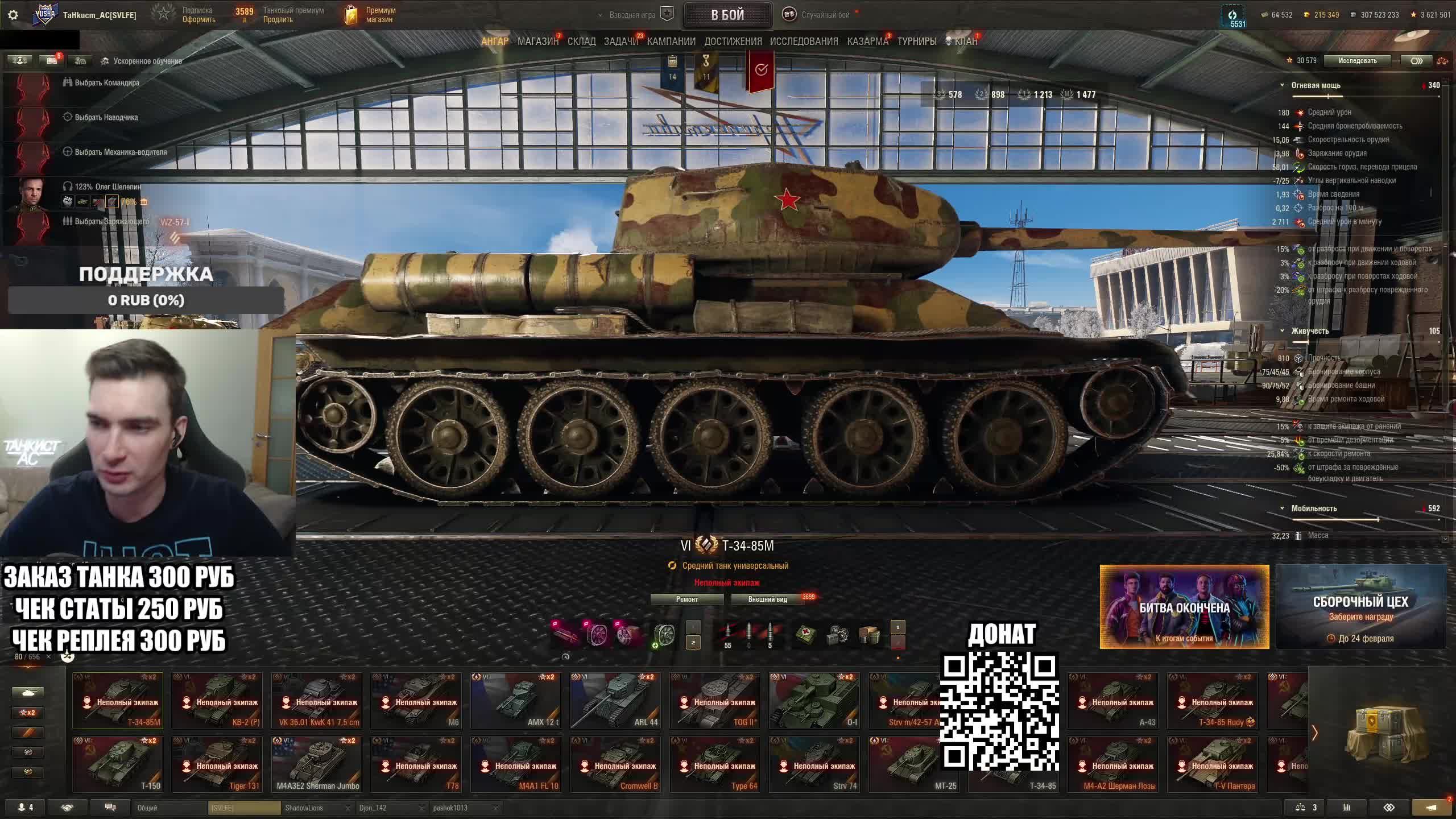 Поддержать стримера http://www.donationalerts.ru/r/tahkucm_ac Сбер без комиссии 2202 2062 2408 9735 напишите в чате, чтобы проверил Telegram https://t.me/TaHkucm_AC Канал VK Play Live https://vkplay.live/tahkucm Канал Бусти https://boosty.to/tahkucm Канал на трово https://trovo.live/TaHkucm_AC Канал Яндекс Дзен https://dzen.ru/id/62355e95d406852937d33526 Группа Вконтакте https://vk.com/tahkucm_ac Оборудование и модернизации на все танки https://docs.google.com/spreadsheets/d/16koQOrtKQKQrAy2Pgfm6GBeG8bA1tJP_7Vm78knwUXA/edit#gid=422106233 Настройки игры в скринах https://dzen.ru/a/YmFvHhJ9yi3rZO5M Моды со скринами установки https://vk.com/topic-136212047_47639792 По поводу рекламы писать в личку https://vk.com/v_xarlamow Всем привет! Меня зовут Виктор, мой ник TaHkucm_AC. На моем канале стрим мира танков каждый день с 8 или 9 по мск. Так же иногда стримлю вечером в произвольное время, чтобы не пропустить подпишитесь на оповещения в телеге или вк (ссылки выше). Играю в танки с декабря 2011 года, а стримить начал в начале 2017 года. Во время стримов общаюсь с чатом, помогаю советами по игре, объясняю тактику. Средняя статистика 65% побед и 4-5к вн8. Фан кланы SLPFR - Командиры marmyn и artlay - из требований только то, чтобы вы часто играли в танки. Укреп 10 уровня. Участвуют в ивентах на ГК, как минимум чтобы собрать пропуск на аукцион. L-DS - Командир DarkSpawn13. Укреп 10 уровня, плюхи по кд SVLFE - Командир Shadowlions. Требуется Team Speak (программа связи) для взводов и клановых покатушек. Участвуют в ивентах на ГК, как минимум чтобы собрать пропуск на аукцион. укреп 10 уровня