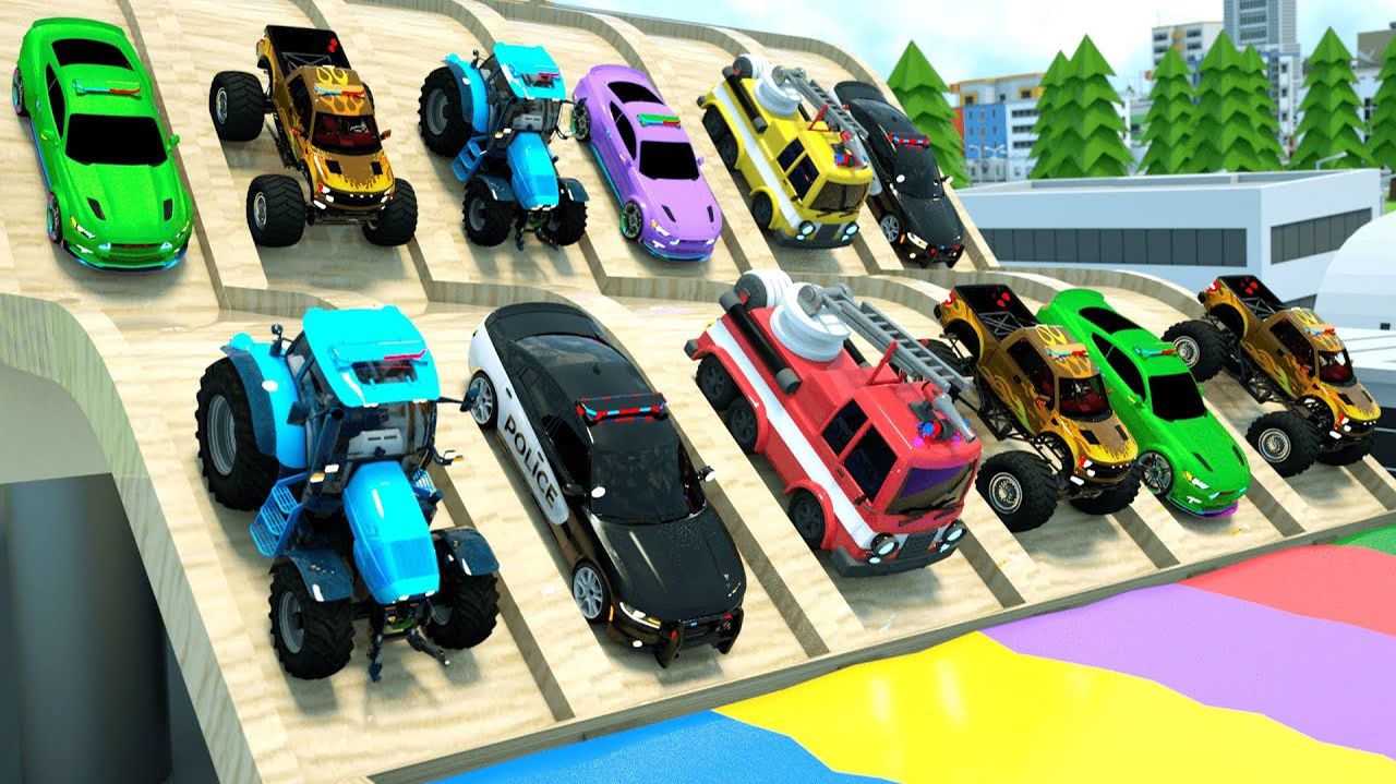 Трактор, полицейская машина, пожарная машина, внедорожник и гоночный автомобиль все цвета для детей