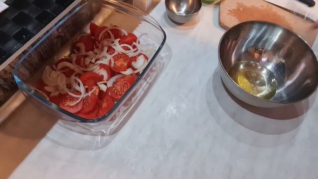 Помидоры салат 500 гр помидоров 1 луковица Заправка 4 ст.л растительного масла 1 ст.л мёда 2,5 ст.л. лимонного сока 2 зубчика чеснока 1 ч.л. сушёного базилика соль по вкусу чёрный перец по вкусу Дать салату настоятся 1 час Если сделать на ночь будет ещё вкуснее