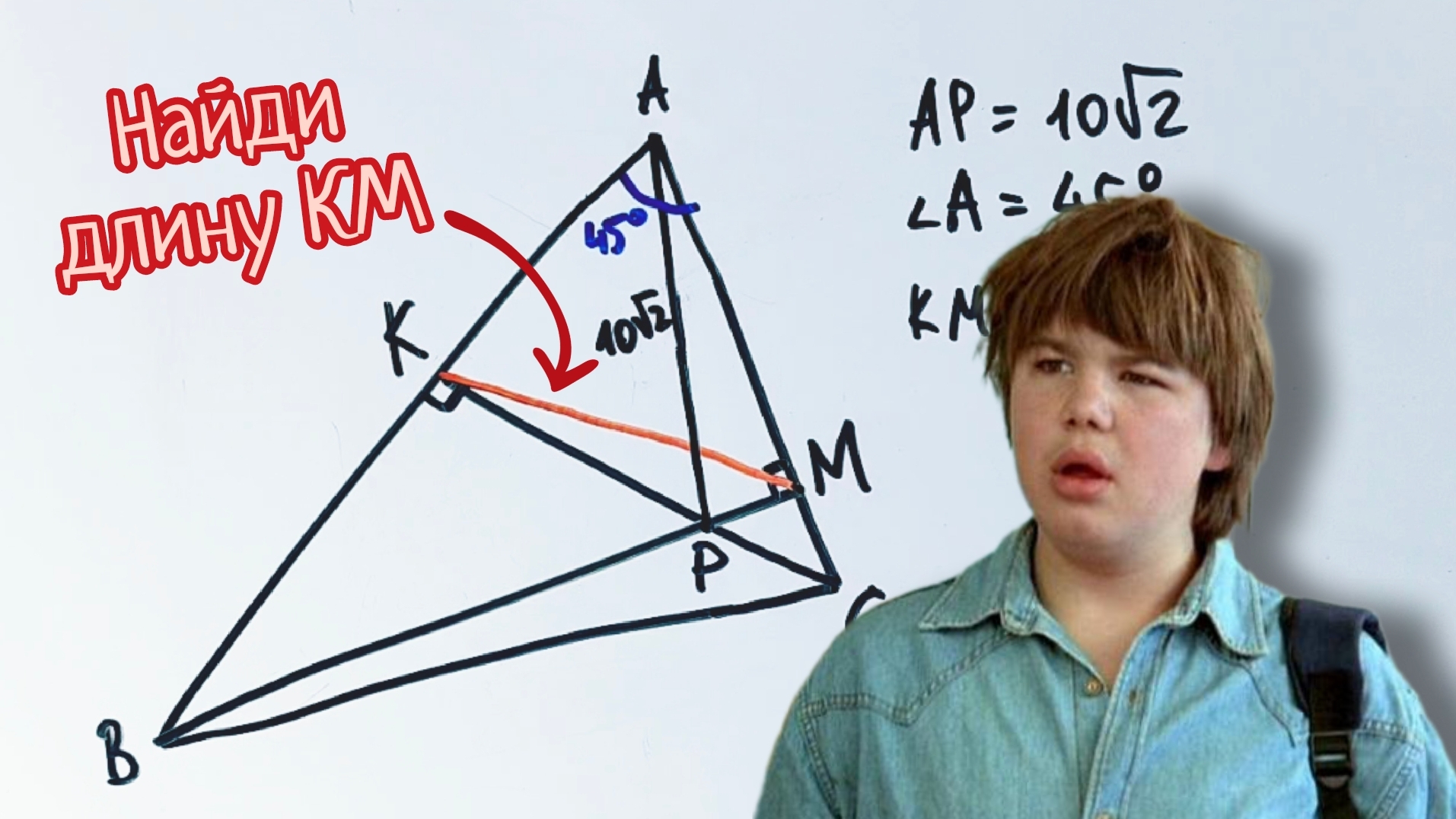 Телеграм "Этому не учат в школе" — https://t.me/yellow_schoo Найди КМ, если угол А равен 45°, а АР=10√2.