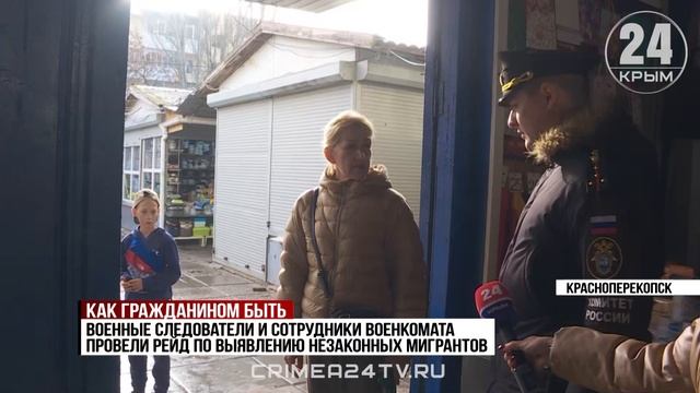 Военные следователи продолжают рейды по выявлению мигрантов, незаконно прибывающих в нашей стране, а также граждан Российской Федерации, которые не встали на воинский учёт. На этот раз с проверкой заглянули на центральный рынок Красноперекопска. Сотрудникам ведомств и ОМОНу многие были не рады. Подробности — в нашем сюжете.