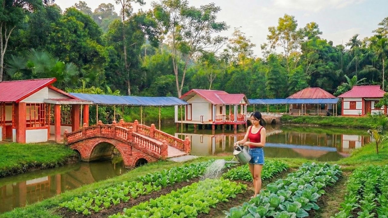 Талантливая женщина строит красивую кухню у арочного моста. Спокойная жизнь на лоне природы.