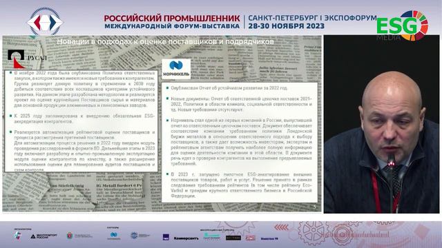 Выступление эксперта в повестке устойчивого развития, Члена экспертного совета по общественному заверению нефинансовой отчетности РСПП Виктора Четверикова на конференции «Роль устойчивости цепочек поставок в развитии российской промышленности», которой прошла в рамках международного форума «Российский промышленник».