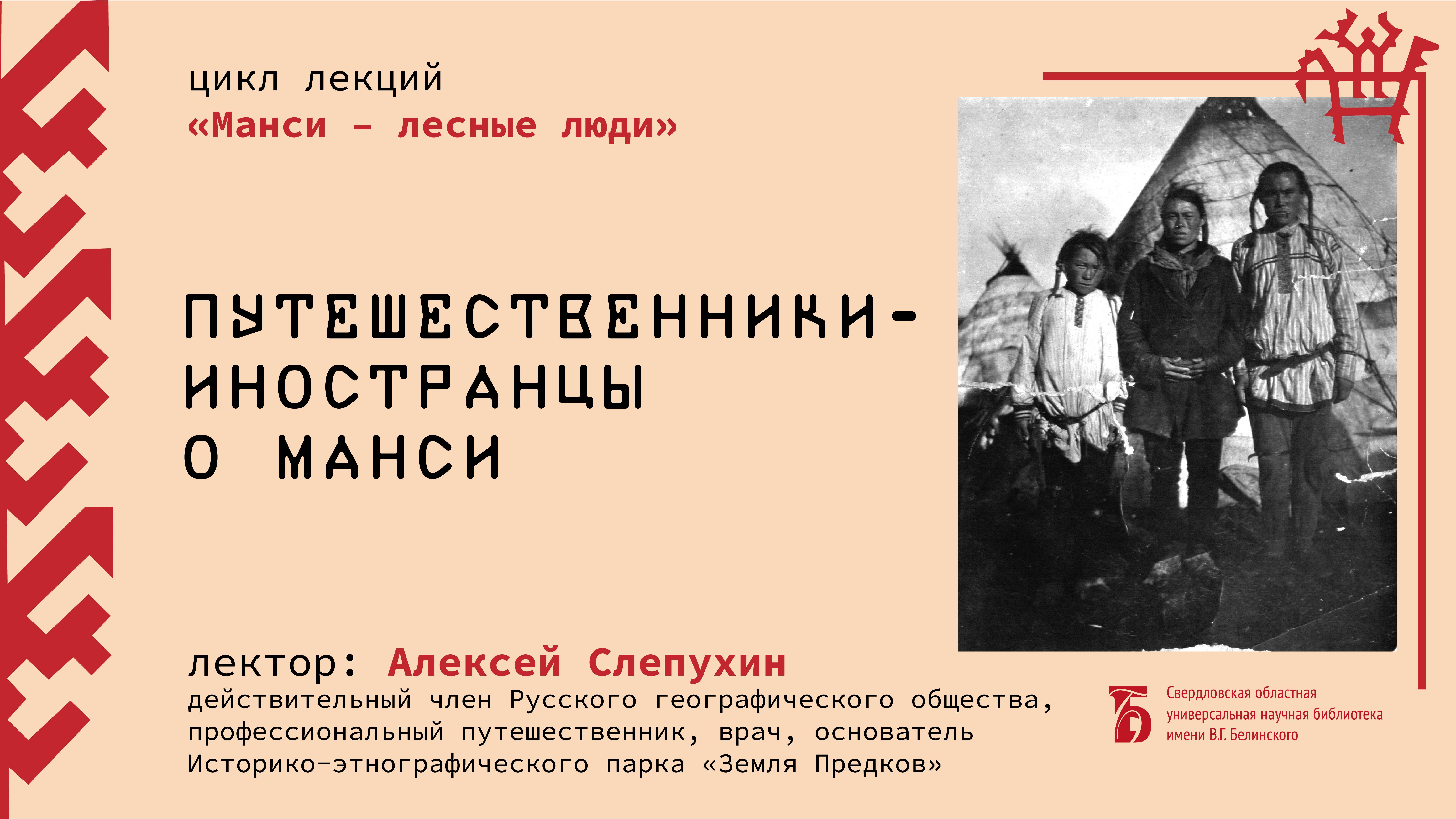 Лекция Алексея Слепухина из цикла «Манси – лесные люди» о первых путешественниках и исследователях обских угров. Лектор – Алексей Слепухин, путешественник, руководитель Комиссии по этнографии и исторической географии Свердловского отделения Русского географического общества. Свердловская областная универсальная научная библиотека им. Белинского http://book.uraic.ru/ сайт https://vk.com/club6745014 VK