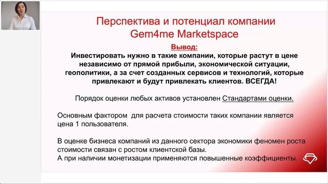Деловая онлайн-встреча: Предложение для инвестора в перспективный высокодоходный бизнес. Встречу проводит: Эксперт в области финансового анализа, аудита и оценки бизнеса Татьяна Тарасова, г. Москва Рекомендую посмотреть каждому ищущему высокодоходное предложение, как можно просто, доступно, профессионально и лаконично показать выгоды инвестирования в динамично развивающийся венчурный проект Gem4me MarketSpace на стадии международного расширения глобального бизнеса. Переходите по ссылке, чтобы получить супер-инструмент, и делитесь со своими будущими Партнерами https://gem4me.com/business_center/session/signup/?sponsor=sosnova8
