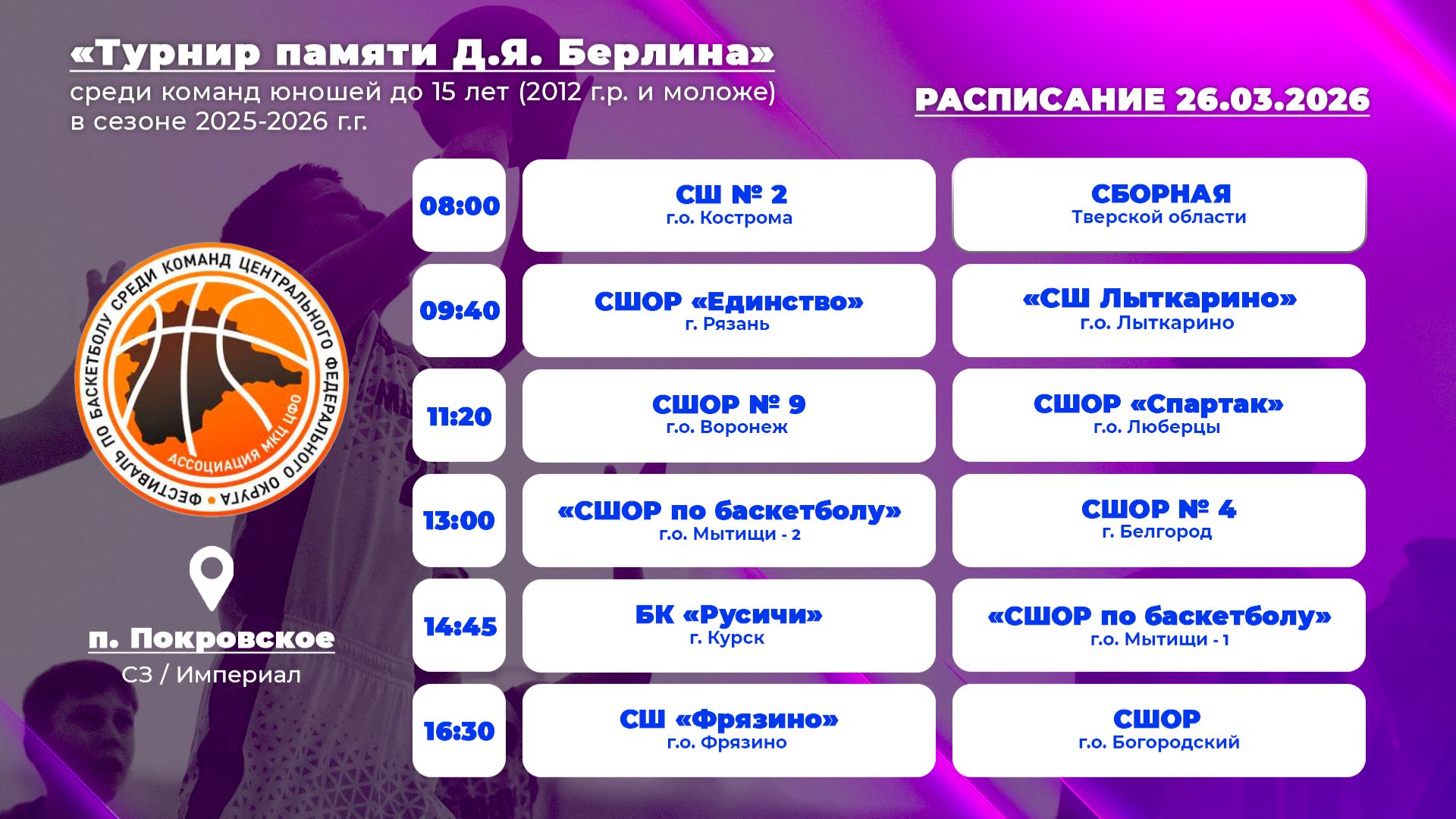 Межрегиональных соревнований «Турнир памяти Д.Я. Берлина» среди команд юношей до 15 лет (2012 г.р.)