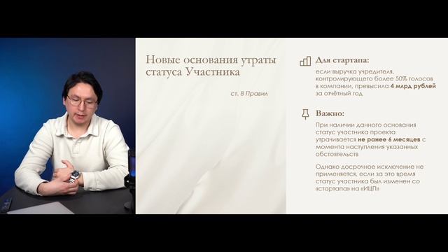 С февраля 2026 года вступают в силу масштабные изменения в ключевых документах «Сколково» — Положении о статусе и Правилах исследовательской деятельности. Незнание новых правил = риск потери статуса, льгот и репутации, если быстро не адаптировать свою деятельность. Эти поправки не просто редакция текста. Это новая реальность, которая затронет каждого резидента: Ужесточение контроля за соответствием деятельности. Новые форматы и сроки отчетности Конкретизация требований к инновационному проекту и коммерциализации. Расширение оснований для досрочного исключения из реестра. Новые процедуры для Исследовательских центров партнеров (ИЦП). Для кого этот вебинар критически важен: CEO/Founders, которые несут стратегическую ответственность за бизнес в «Сколково». CFO/Финансовые директора, отвечающие за отчетность, налоги и соответствие критериям. Юристы и compliance-менеджеры компаний-резидентов. Компании, только планирующие подать заявку на статус участника. ТГ канал "Зарцын и партнеры" https://t.me/digital_zarlaw ТГ "Школы IT юриста" https://t.me/itpravotech
