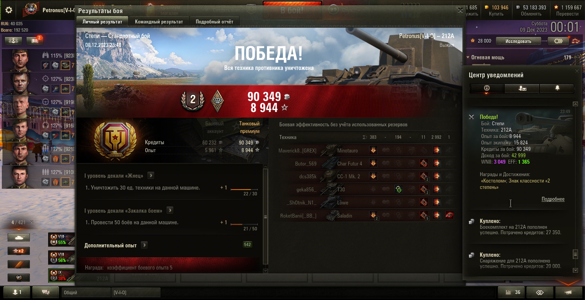 Победа! Бой: Степи, Техника: 212А, Степи, 2992 урон, 1 фраг Опыт за бой: 8 944 , Опыт экипажу: 15 824, Кредиты за бой: 90 349, Доход за бой: 42 999, WN8: 3 049, EFF: 1 365, Награды и Достижения: «Костолом»; Знак классности «2 степень»