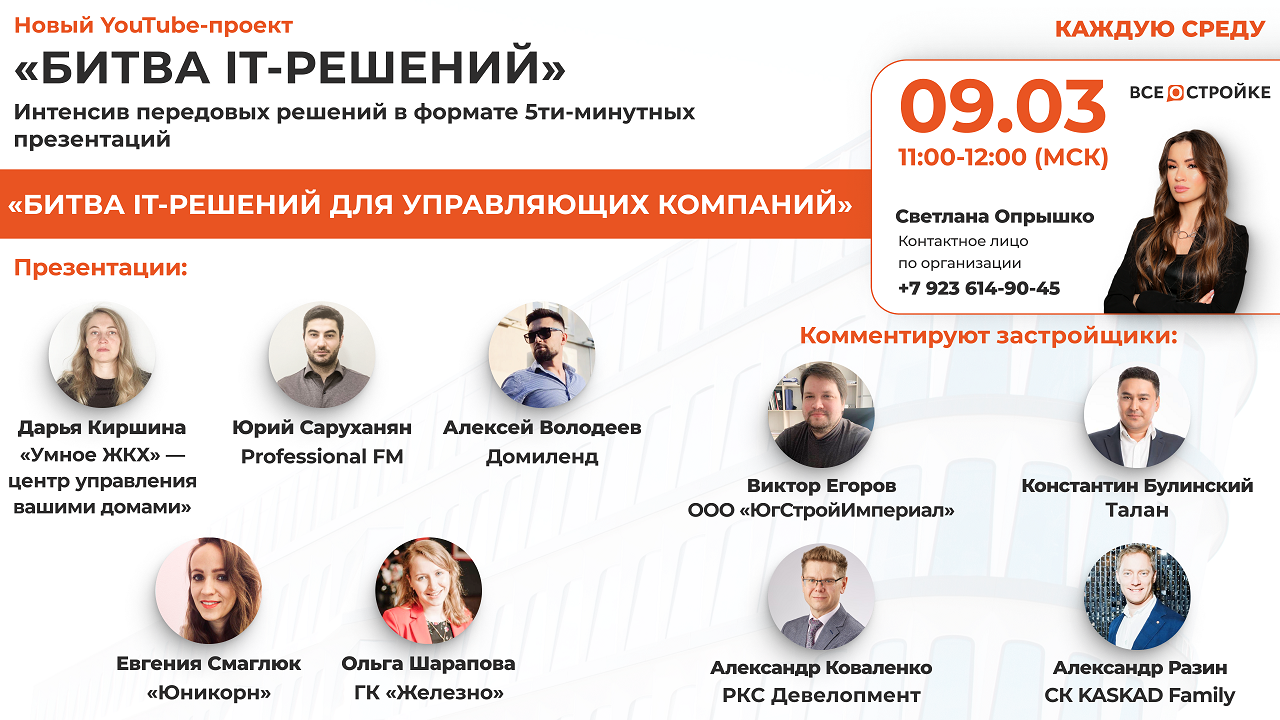 Битва it-решений— это интенсив передовых решений в формате 5-ти минутных презентаций. Презентации: 1. Дарья Киршина — Директор по маркетингу «Умное ЖКХ» — центр управления вашими домами» 2. Юрий Саруханян — Директор по автоматизации и инновациям Professional FM 3. Алексей Володеев — CBDO Домиленд 4. Евгения Смаглюк — Руководитель отдела сопровождения управляющих организаций компании «Юникорн» 5. Ольга Шарапова — Владелец продукта Мажордом ГК «Железно» Комментируют застройщики: 1. Виктор Егоров — Руководитель инвестиционных проектов ООО «ЮгСтройИмпериал» 2. Константин Булинский — Заместитель генерального директора по IT компании Талан 3.Александр Коваленко — Коммерческий директор РКС Девелопмент 4. Александр Разин — Директор департамента клиентского обслуживания семейства компаний KASKAD Family А чтобы не пропустить наши эфиры — подписывайтесь на канал? По вопросам сотрудничества пишите ?? 8-923-614-9045 (What’sApp) ? Наш сайт: http://vse-o-strojke.ru/